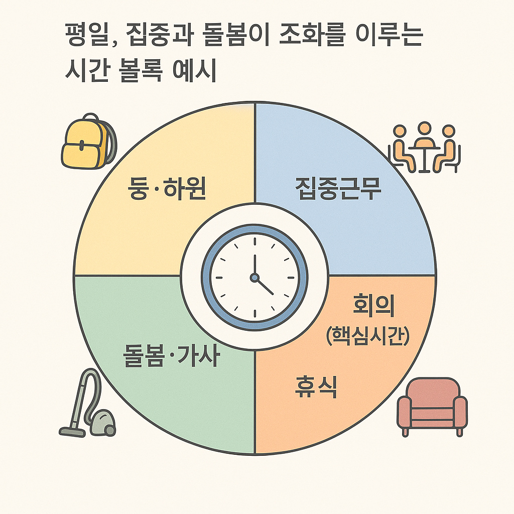 - 재택근무: 팀 규칙에 따라 핵심 협업시간을 정하고, 나머지는 업무·돌봄 블록으로 분리해 피로도↓, 예측가능성↑.