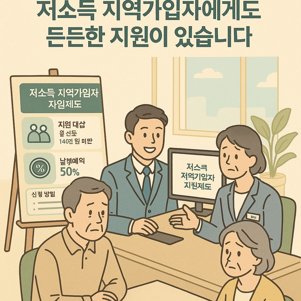 육아로 인해 소득이 일시적으로 감소한 경우, ‘저소득 지역가입자 보험료 지원제도’를 활용할 수 있습니다. 지원 요건은 재산 6억 원 미만, 연 소득 1,680만 원 이하이며, 대상자는 국민연금공단을 통해 신청 가능합니다.