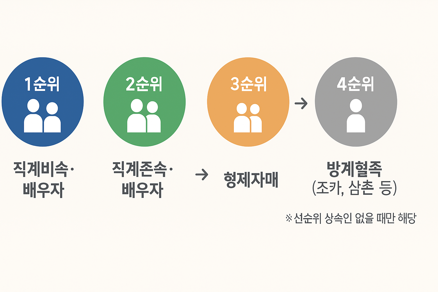 - 1순위: 직계비속(자녀·손자녀 등) + 배우자