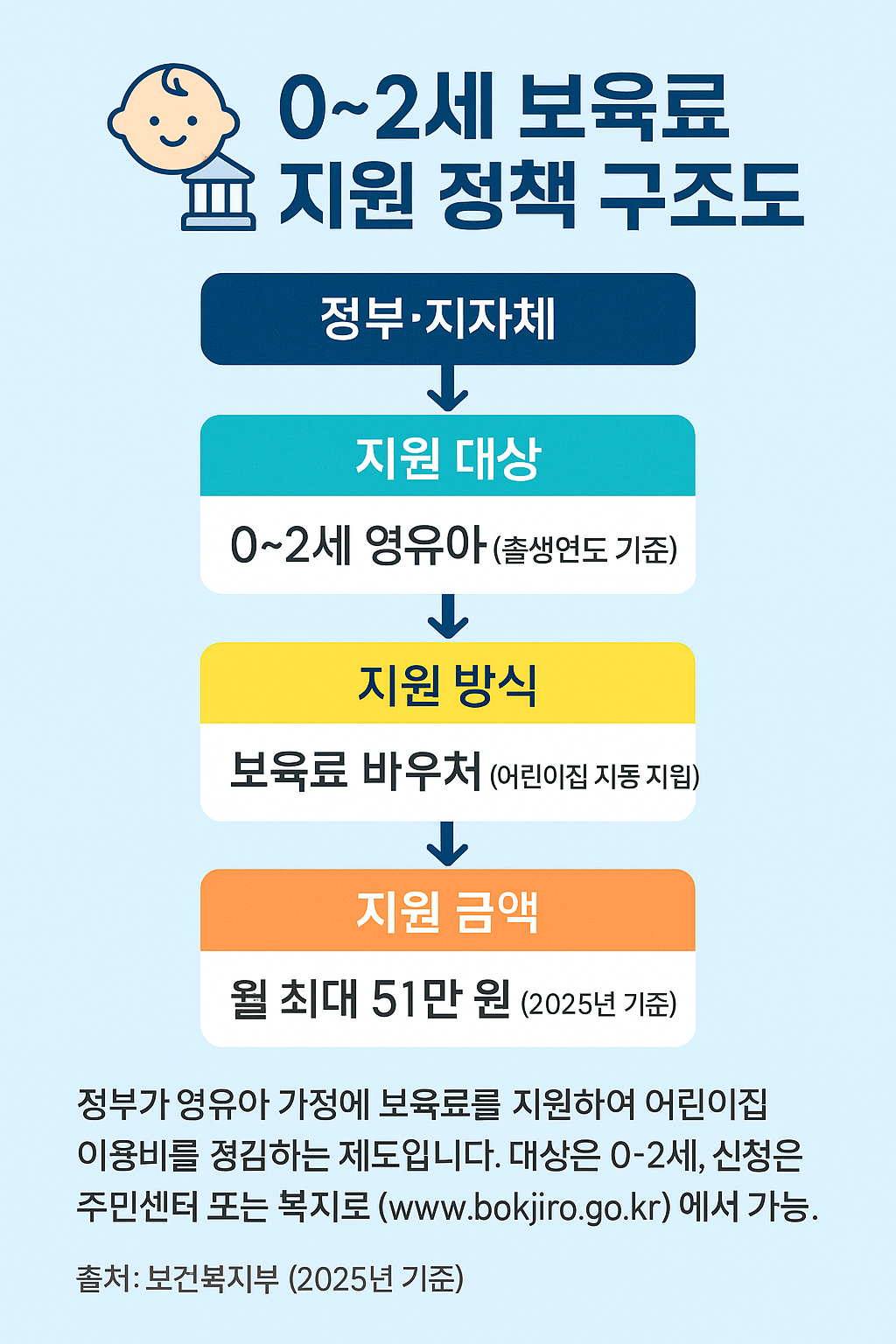 · 2025년부터 만 0~2세 영아의 보육료가 전 계층 전액 지원됩니다.