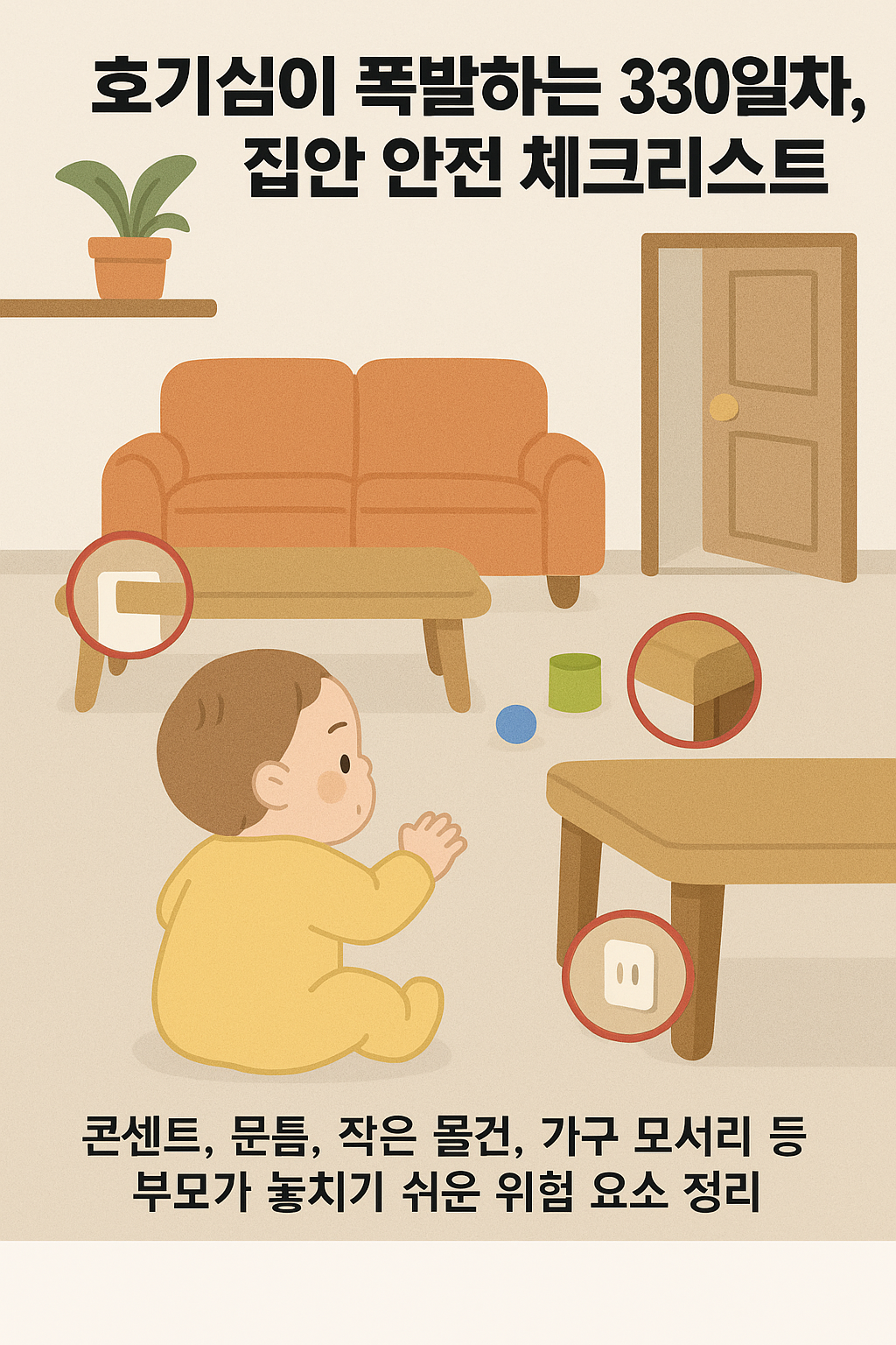 330일(약 11개월) 아기는 기고, 잡고 서고, 잡히는 모든 것을 탐색합니다. 이 글은 콘센트, 문틈, 작은 물건, 가구 모서리 등 부모가 놓치기 쉬운 위험 요소를 한눈에 점검하고, 사고를 예방하는 실전 안전 루틴까지 제공합니다.