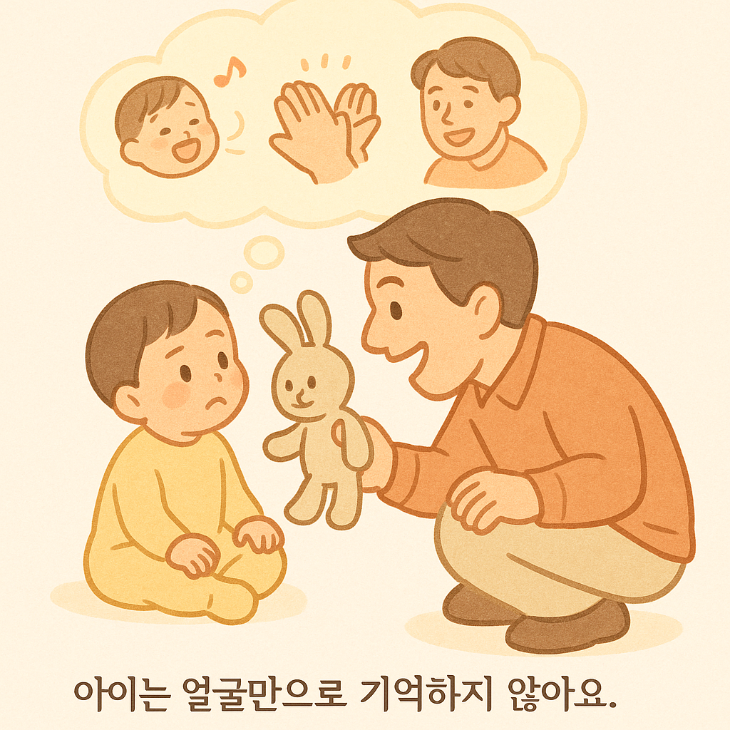 - 특정 놀이 반복: 이전에 했던 놀이(예: 손뼉 치기나 인형 놀이)를 다시 해보세요. 감정 경험(웃음, 포옹)이 기억을 자극해요.