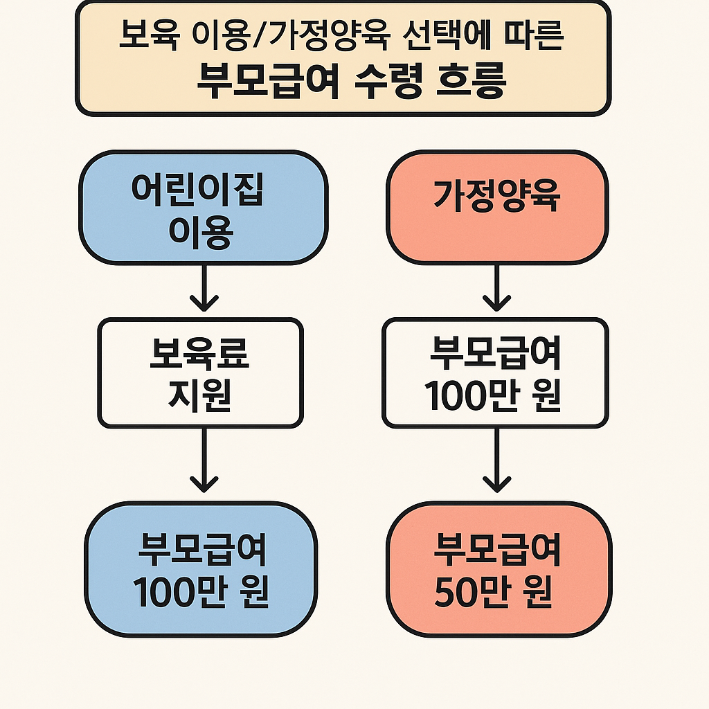 - 보육시설 이용 시: 부모급여는 보육료 우선 차감 후 차액 현금. 양육수당은 보육료와 동시 수급 불가.
