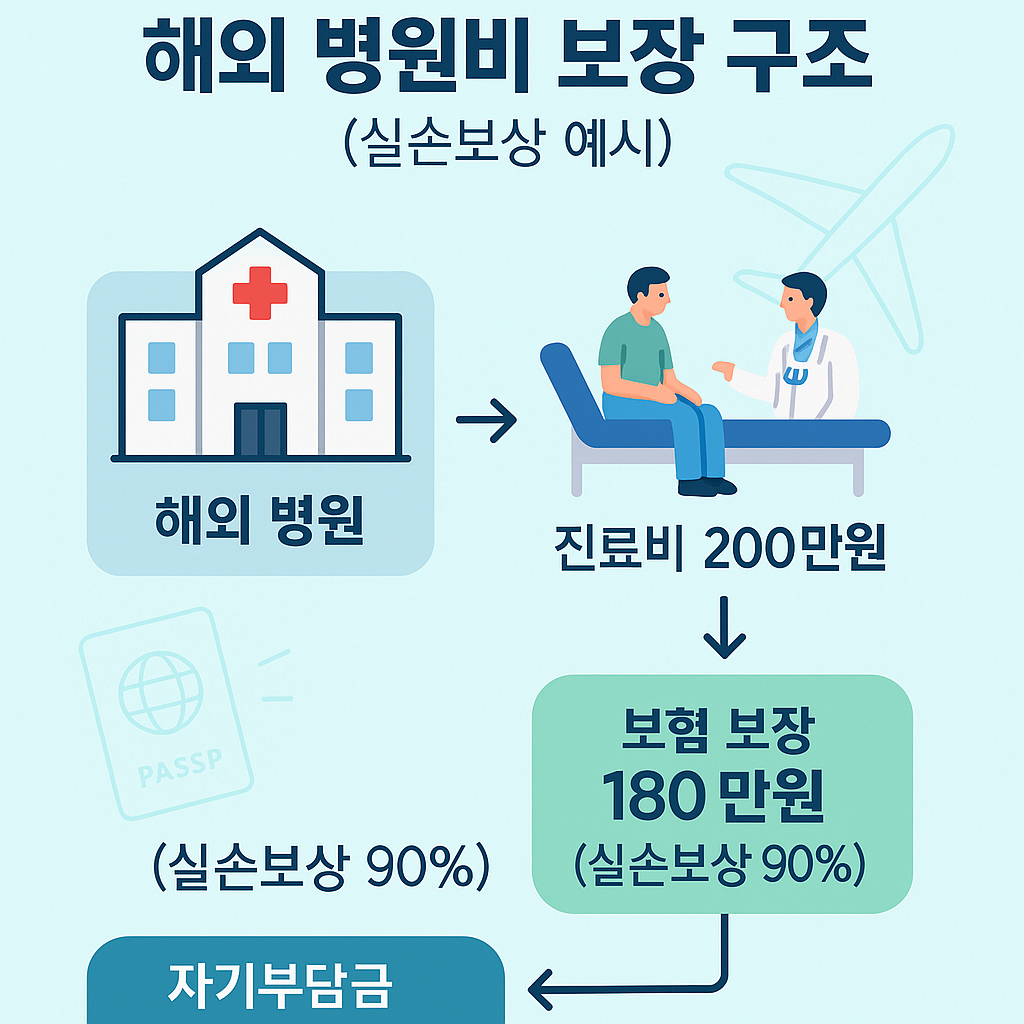 가족여행자보험의 가장 핵심적인 보장 항목은 해외 병원비입니다. 해외 의료비는 국내보다 평균 5~10배 비싸며, 어린이·노년층이 포함된 가족여행일수록 위험이 높습니다. 2025년형 보험상품은 대부분 “해외 의료기관 이용 시 실제 지출 의료비를 가입금액 한도 내 실손 보상”하는 구조로 설계되어 있습니다. 예를 들어 하나손해보험은 해외 상해·질병 치료 시 최고 3,000만 원 한도 보장을 제공합니다.