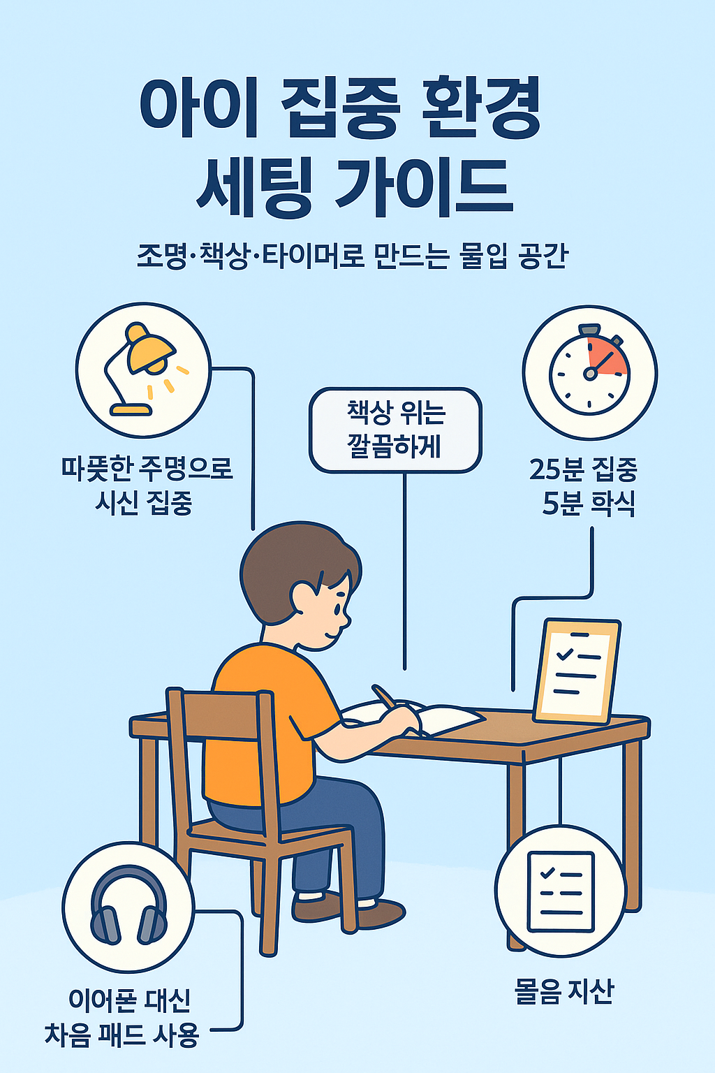 - 아이 집중력은 타고난 능력이 아니라 ‘반복되는 루틴’과 ‘환경 설계’의 결과입니다.