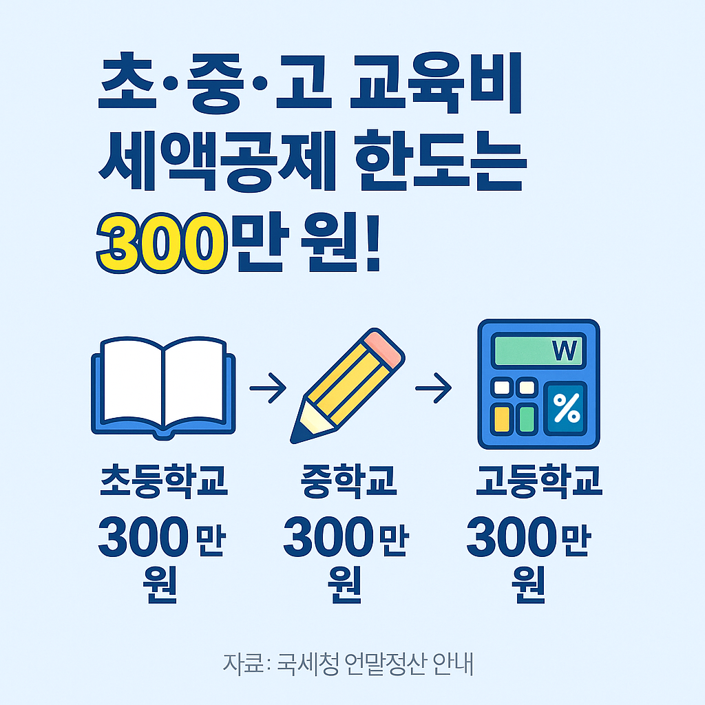 - 공제한도: 취학 전·초·중·고 1인당 300만 원/연(근로자 기본공제대상 자녀 기준).