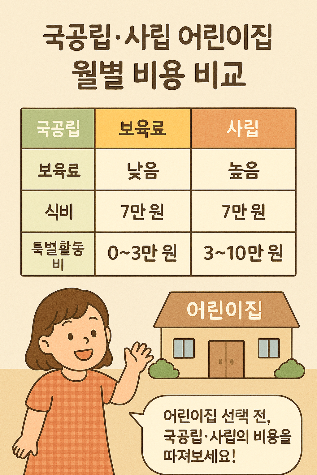 ✅ 결론: 국공립 어린이집이 월평균 약 10~15만 원 저렴하며, 보육료 지원금(바우처) 적용 후 실부담액은 5만 원 이하로 줄어들기도 합니다.